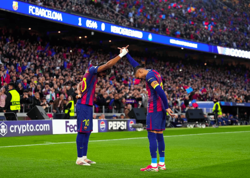 第28分钟,亚马尔太过松弛的脚后跟传球出现失误,巴恩斯的传中打穿阿劳霍的小门,伊兰加梅开二度。